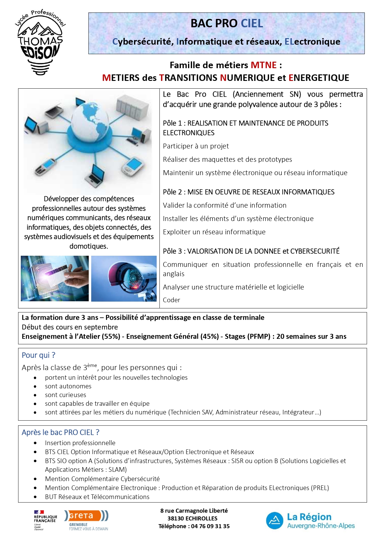 Dans le cadre de la réforme de la Seconde Professionnelle entrée en vigueur en 2021, les élèves qui souhaitent préparer un Baccalauréat Professionnel CIEL (Cybersécurité Informatique et réseau, ÉLectronique) se verront affectés dans une classe de seconde dénommée Seconde MTNE (Métiers des Transitions Numérique et Énergétique).